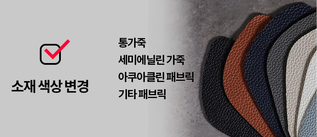 통가죽 / 세미에닐린 가죽 / 아쿠아클린 패브릭 / 기타 패브릭 으로 소재 색상 변경이 가능합니다.