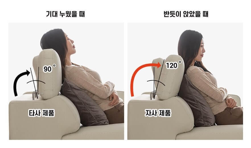 타사 제품의 소파와 달리 120도까지 기울어지는 각도로 제작되어 기대 누웠을 떄는 물론, 반듯이 앉았을 때도 목을 편안하게 받쳐주는 인체공학적 설계로 섬세하게 제작되었습니다.