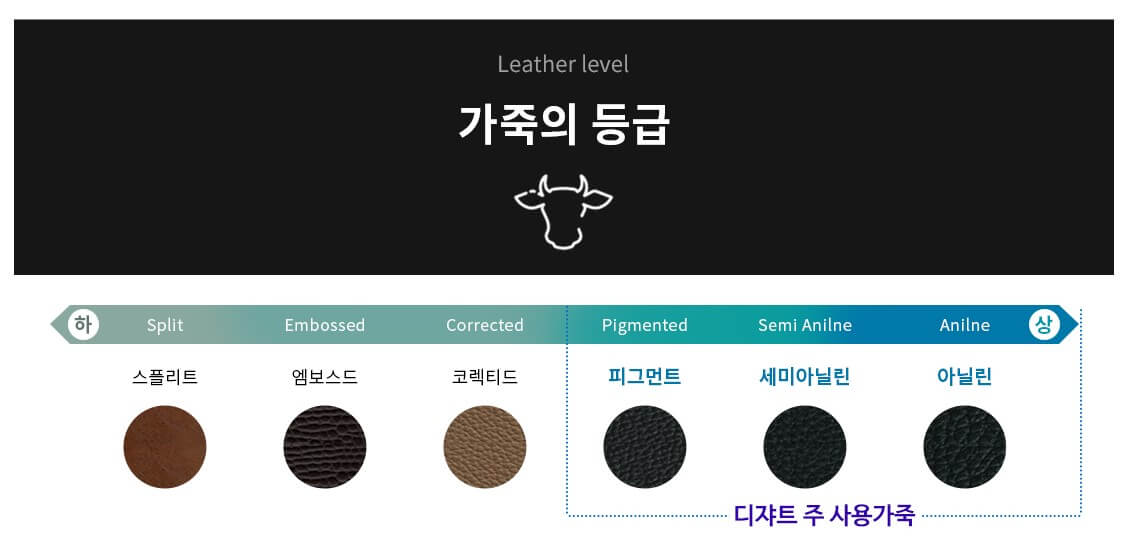 가죽의 등급을 봤을 때 디쟈트 주 사용가죽은 상급인 피그먼트, 세미아닐린, 아닐린을 사용합니다.