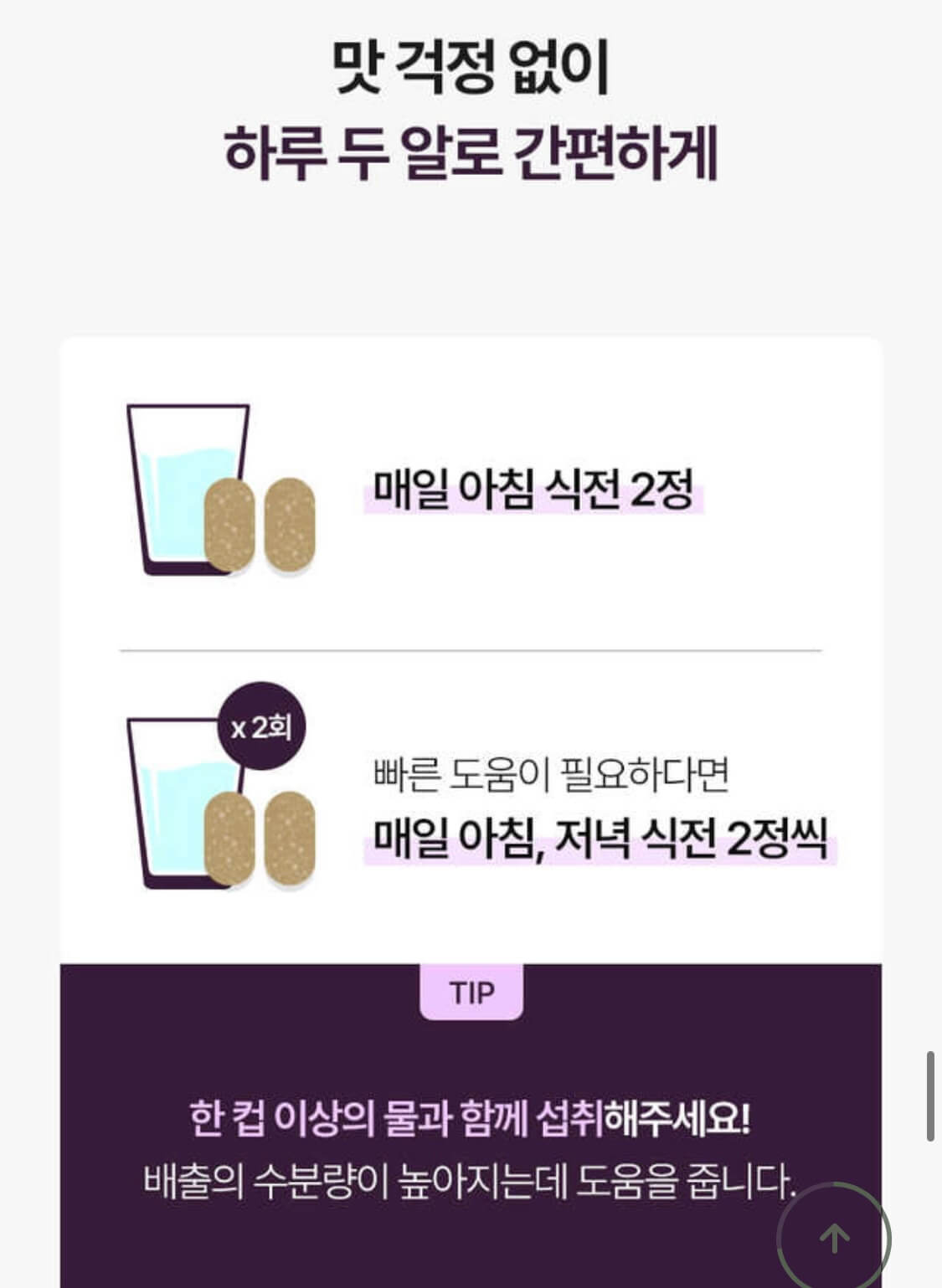 Q4. 1일 섭취 권장량이 있나요? 매일 아침 식전 2정을 충분한 물과 함께 섭취하시면 됩니다. 빠른 도움이 필요하신 분은 매일 아침과 저녁 2회로 회당 2정으로 늘려 섭취하시는 것을 추천합니다.